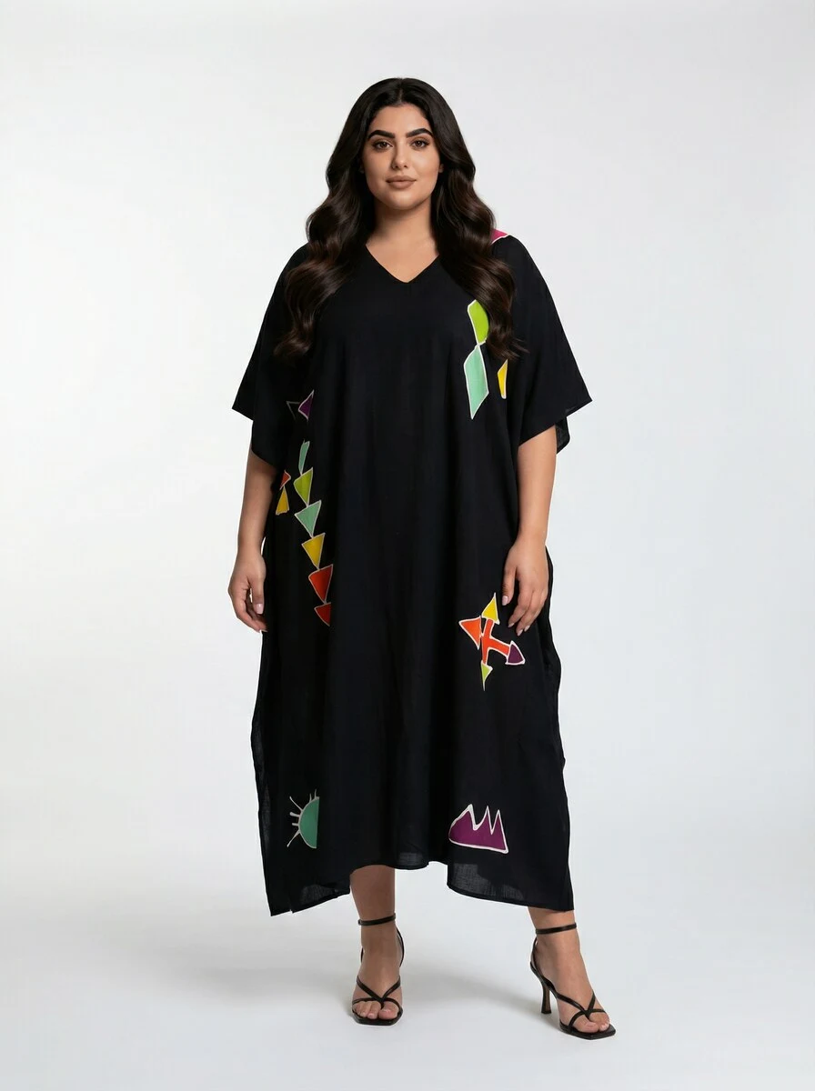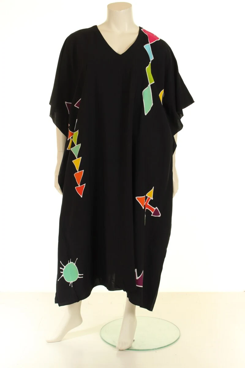 Denne kaftan-kjole har et afslappet, flydende snit med en V-hals og løse ærmer. Lavet af 100% håndmalet batik glat viskose og er one size. Den brede, lige silhuet sikrer både komfort og elegance. Passer op til 160 cm bryst og hofte mål. Perfekt til et sofistikeret og unikt sommerlook.