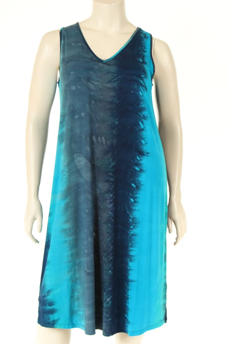 Denne elegante kjole er lavet af 90% viskose og 10% spandex jersey, med et batikprint for et unikt præg. Den har en flatterende V-udskæring og et ærmeløst design, ideelt til varmere vejr. Kjolen tilbyder en komfortabel, afslappet pasform med en længde på cirka 116 cm (størrelse 1), hvilket gør den til et alsidigt valg til både afslappede og mere formelle anledninger.