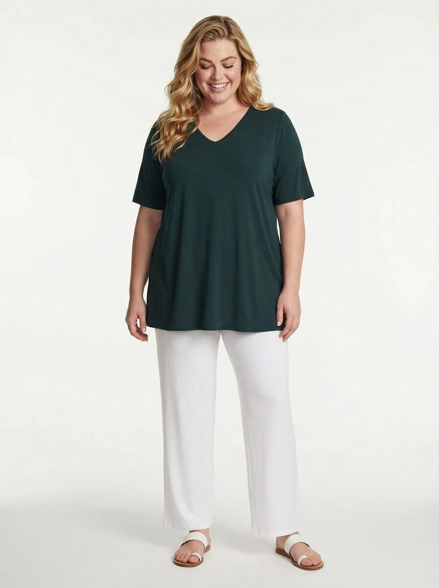 Denne bluse er lavet af en blanding af 90% viskose og 10% spandex jersey, som giver en blød og let strækbar pasform og et tungt fald. Den har en V-udskæring og korte ærmer, hvilket giver et afslappet og komfortabelt fit. Den lige nederste kant giver en enkel og flatterende afslutning. En alsidig bluse, perfekt til både hverdagsbrug og lag-på-lag styles.