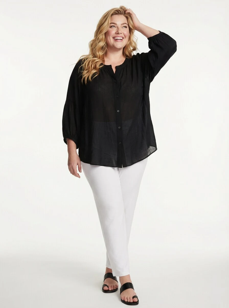Dieses Hemd besteht aus 100% Chiffon-Viskose. Es verfügt über eine geknöpfte Vorderseite, 3/4-Ärmel mit Rüscheneffekt und einen abgerundeten unteren Saum. Der Rücken ist zweimal mit Rüschendetails geschnitten, was für eine lockere, bequeme Passform sorgt. Die Länge beträgt etwa 80 cm in Größe 1 und bietet einen entspannten und stilvollen Look. Ein stilvolles und bequemes Hemd mit lockerer Passform, perfekt für die Freizeit.