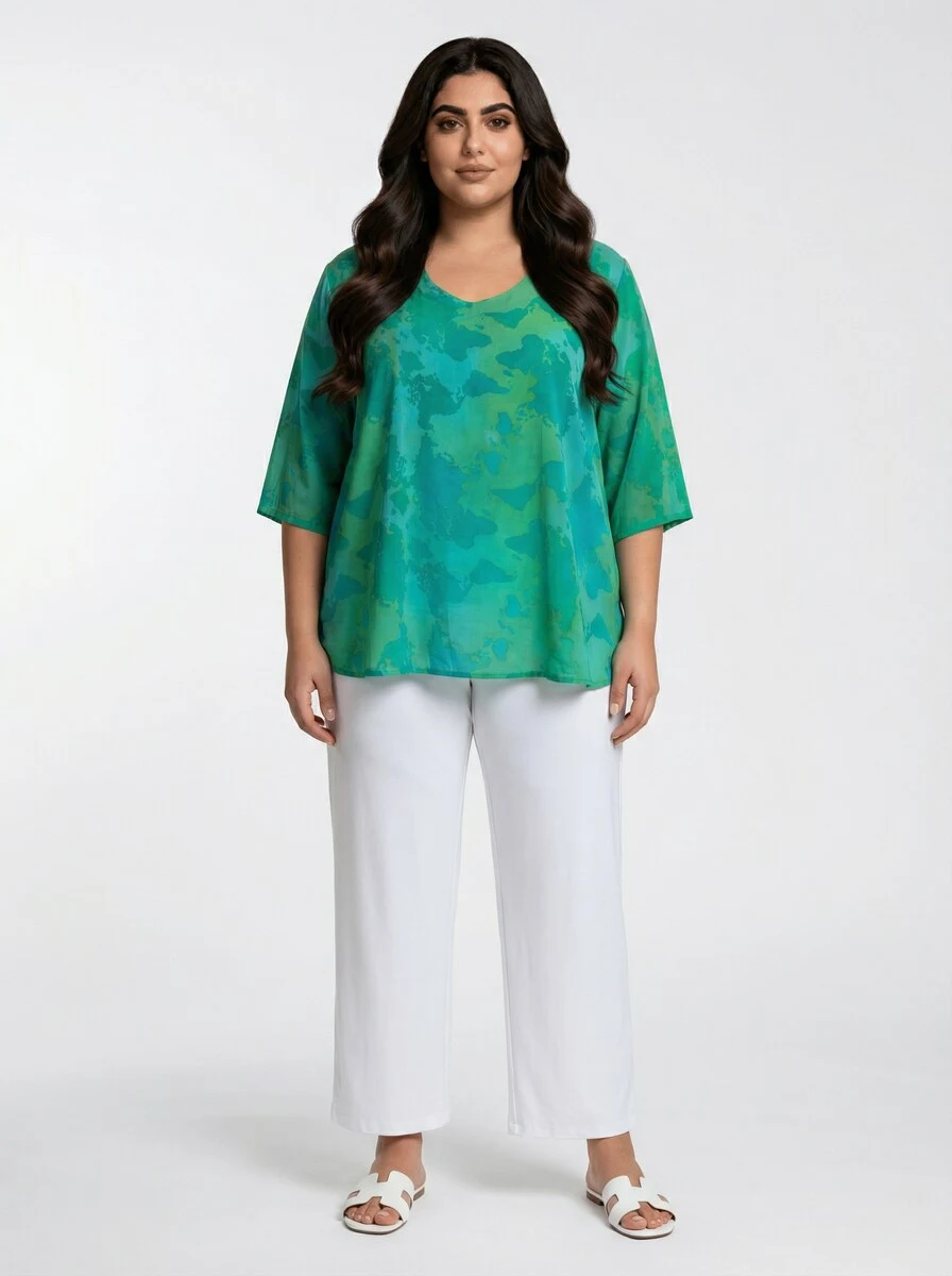We use a lot of the crinkle viscose fabric which we call AC or KT, so all the styles starting with these initials are crinkle fabric. Many people like the fact that the crinkle fabric is very flexible. When you wash the crinkle fabric, it will shrink quite a lot and this may alarm you. The garment can then be ironed and/or steamed back to its original size. This also means that if the fit is slightly too big on you, you can wash it, disregard the ironing and when you put it on it will accommodate you and get bigger with wear. Or as I have heard one shop advise its customers, if they find the sleeves too big, then refrain from ironing the sleeves after wash. Some customers wash, hang and wear and then after about half an hour to an hour the garment fits nicely.