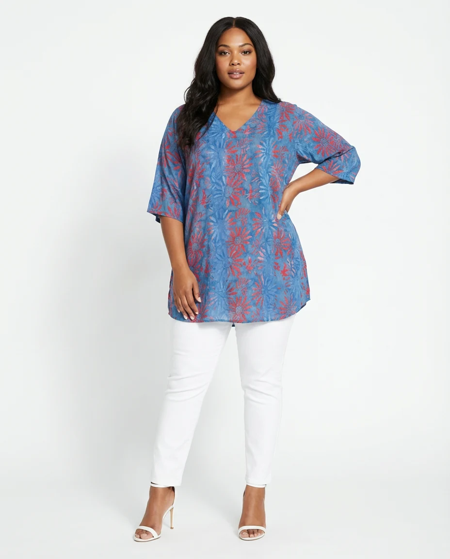 Cette tunique est fabriquée en 100% viscose froissée APR, conçue avec un batik peint à la main pour un imprimé unique et artistique. Elle présente un col en V, des manches 3/4 et deux poches latérales. Une tunique élégante qui offre à la fois confort et élégance pour un look décontracté et casual.