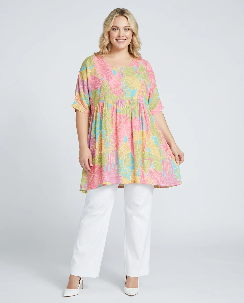 A stylish, oversized tunique offering comfort and elegance with frill details at the front and back.