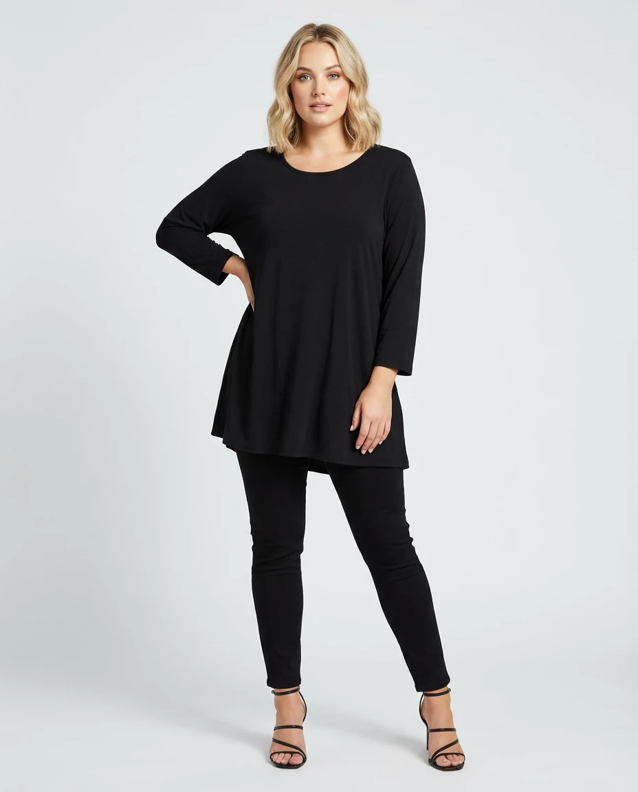 This elegant tunique is made from 100% Sousdi viscose and features a boat neck, long raglan sleeves, and one outside pocket. The tunique offers a relaxed fit, perfect for both casual and formal occasions. Its length is approximately 94 cm in size 1.