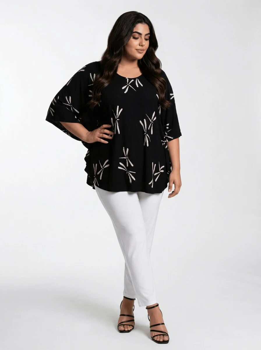 This blouse is made from 100% viscose jersey batik fabric, offering both comfort and flexibility. It features a U-shaped neckline, butterflysleeves, and a rounded bottom hem for a flattering fit. The length is approximately 80 cm for size 1, making it suitable for casual or semi-formal occasions. A versatile and stylish blouse.