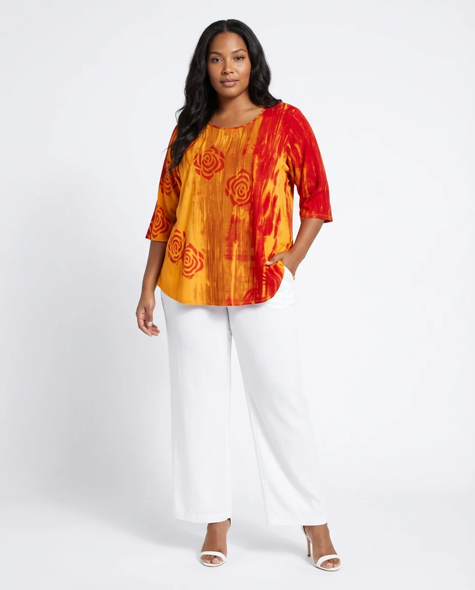 10/90% spandex/viscose jersey batik. Blouse U neck 3/4 sleeve rounded bottom