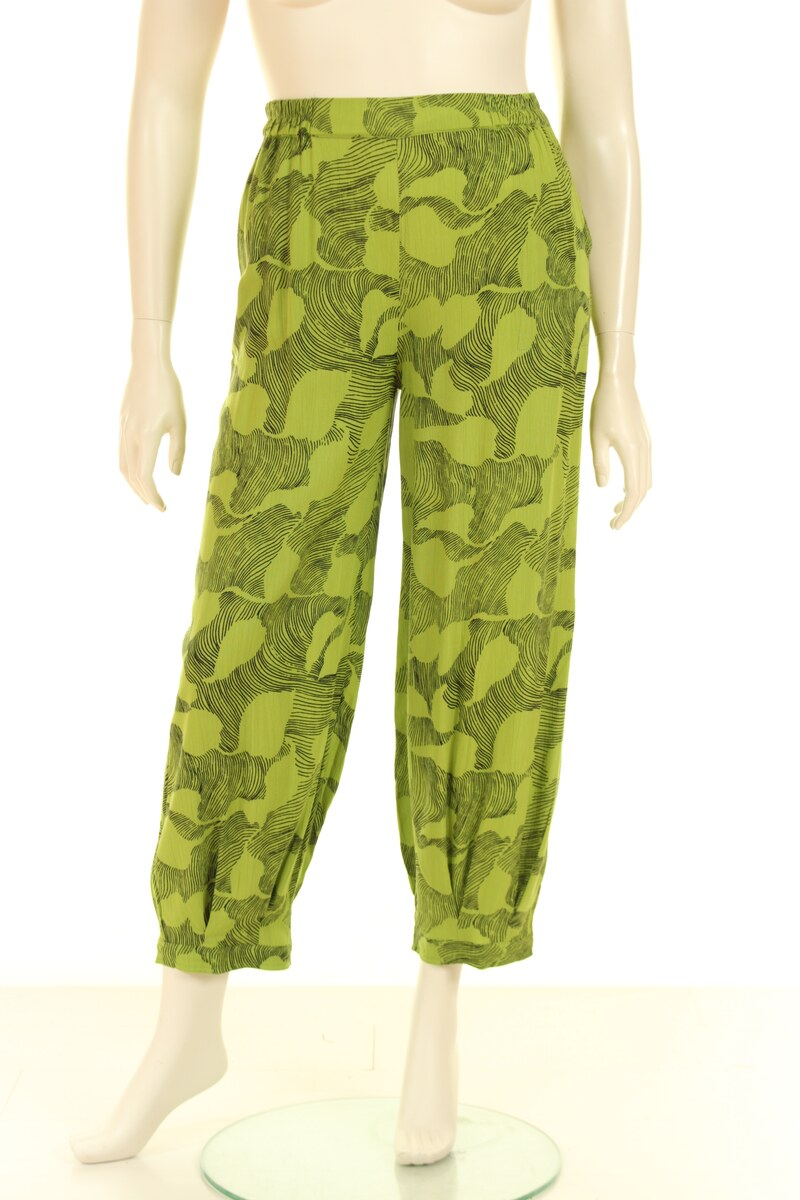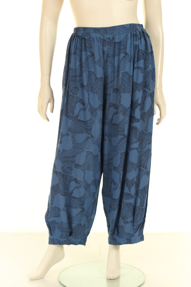 A comfortable and stylish pair of pants designed with wide legs gathered with pleats at the bottom in a printet crinkled viscose. An elasticated backside waistband for a relaxed fit. Easy to style for both casual and semi-formal looks. A versatile wardrobe staple for warmer weather. These pants combine comfort and style for an effortless look.