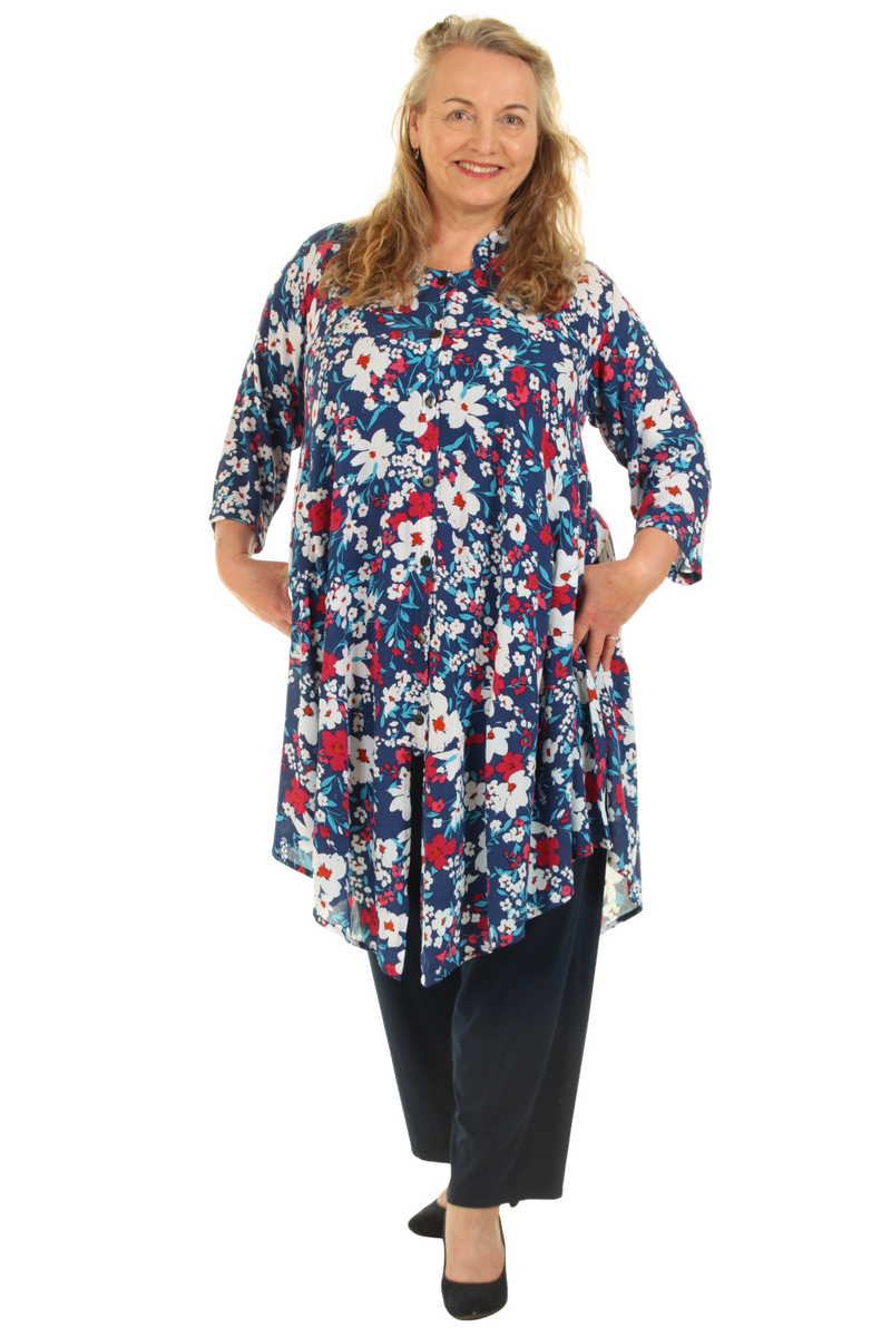 DETAILS: Buttoned U-neck with Chinese collar, 3/4 sleeves, A-line fit, asymmetrical hem, two side pockets.