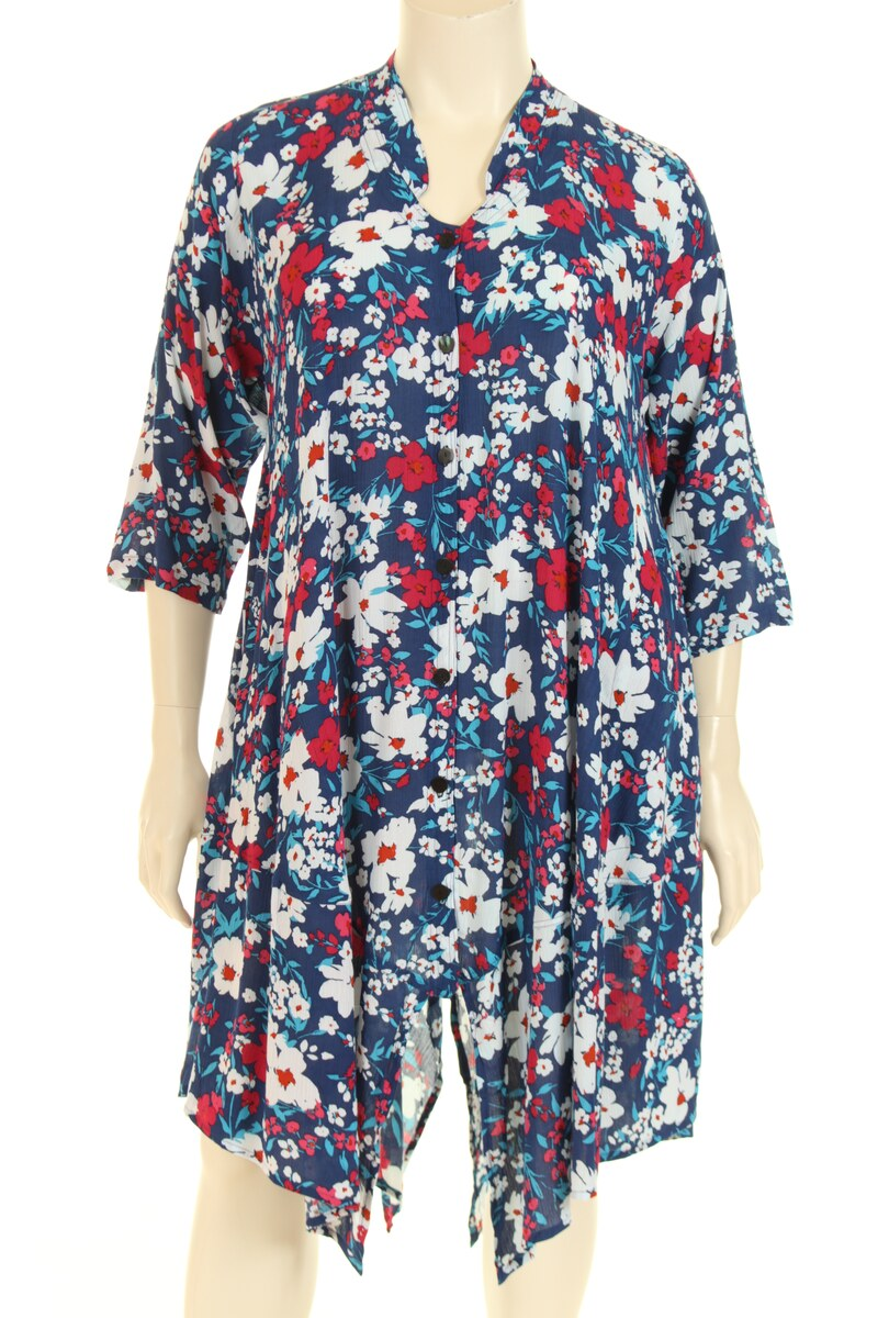 This versatile shirt jacket dress is made from 100% printed crepe viscose. It features a buttoned U-neck with Chinese collar, 3/4 sleeves and a flattering A-line fit. The asymmetrical hem adds a unique touch and the shirt has two side pockets for added functionality. A perfect combination of style and comfort, ideal for any occasion.