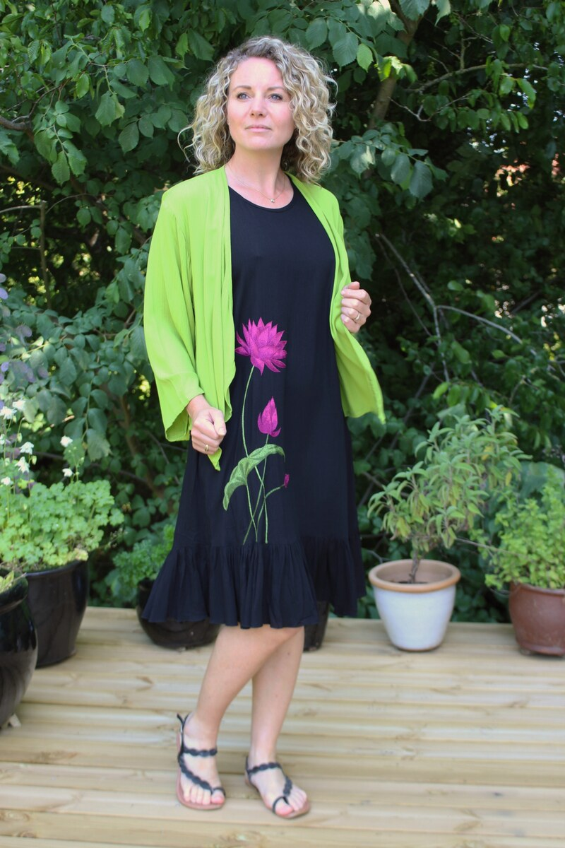 We use a lot of the crinkle viscose fabric which we call AC or KT, so all the styles starting with these initials are crinkle fabric. Many people like the fact that the crinkle fabric is very flexible. When you wash the crinkle fabric, it will shrink quite a lot and this may alarm you. The garment can then be ironed and/or steamed back to its original size. This also means that if the fit is slightly too big on you, you can wash it, disregard the ironing and when you put it on it will accommodate you and get bigger with wear. Or as I have heard one shop advise its customers, if they find the sleeves too big, then refrain from ironing the sleeves after wash. Some customers wash, hang and wear and then after about half an hour to an hour the garment fits nicely.