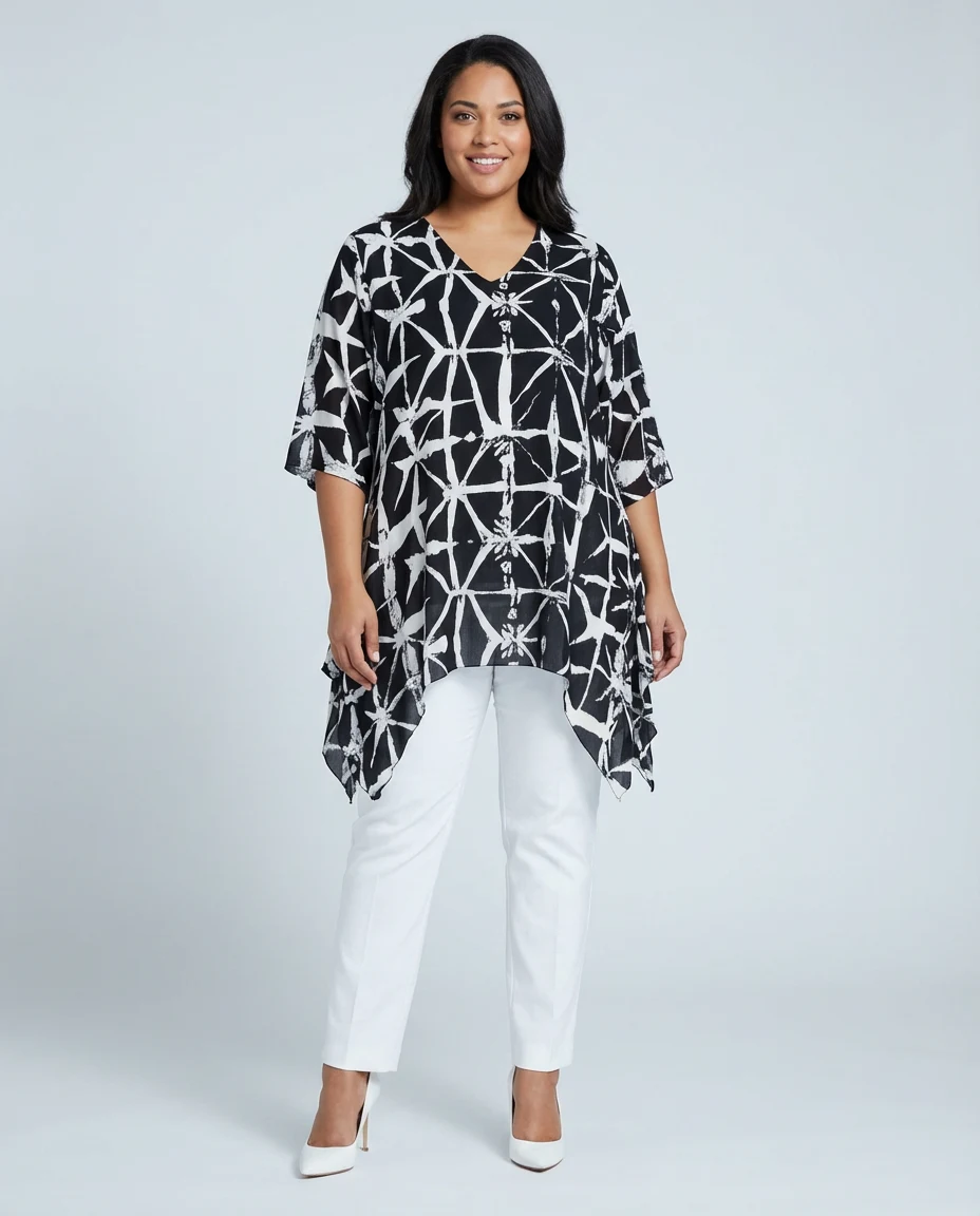 This elegant tunique is made from 100% crepe viscose with a print, offering a comfortable and relaxed fit. It features a flattering V-neckline, short sleeves, and two side-seam pockets, making it both practical and stylish for everyday wear. A chic and versatile tunique for any wardrobe.